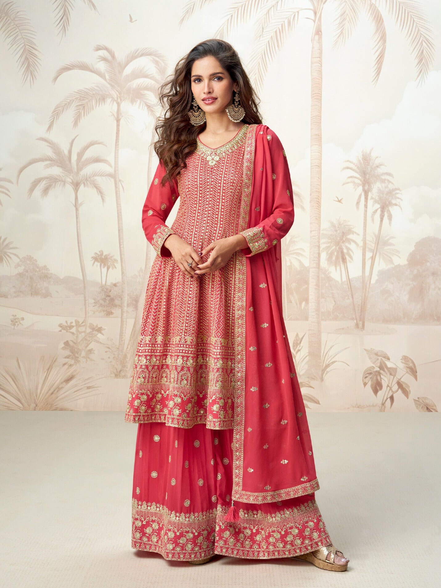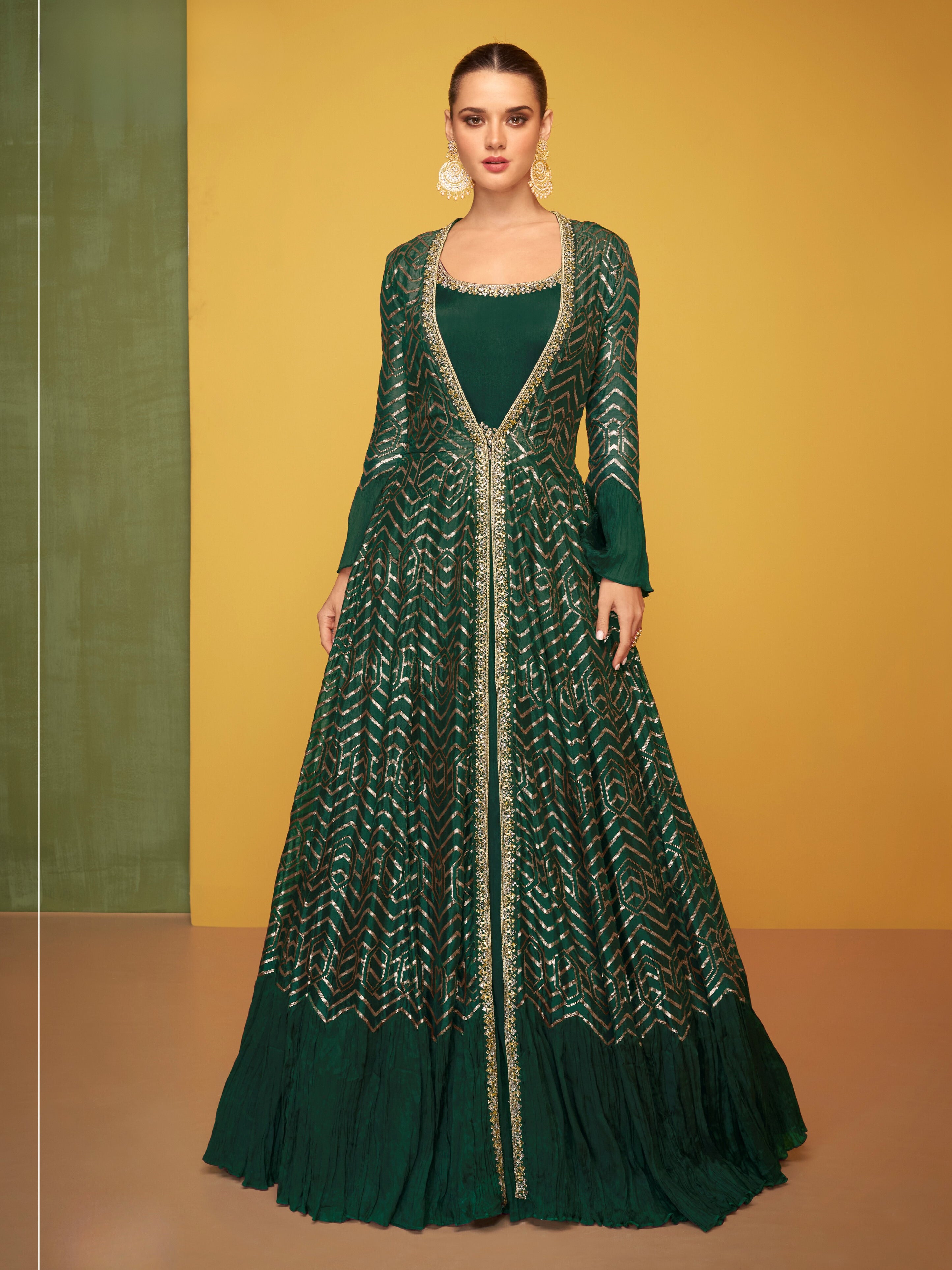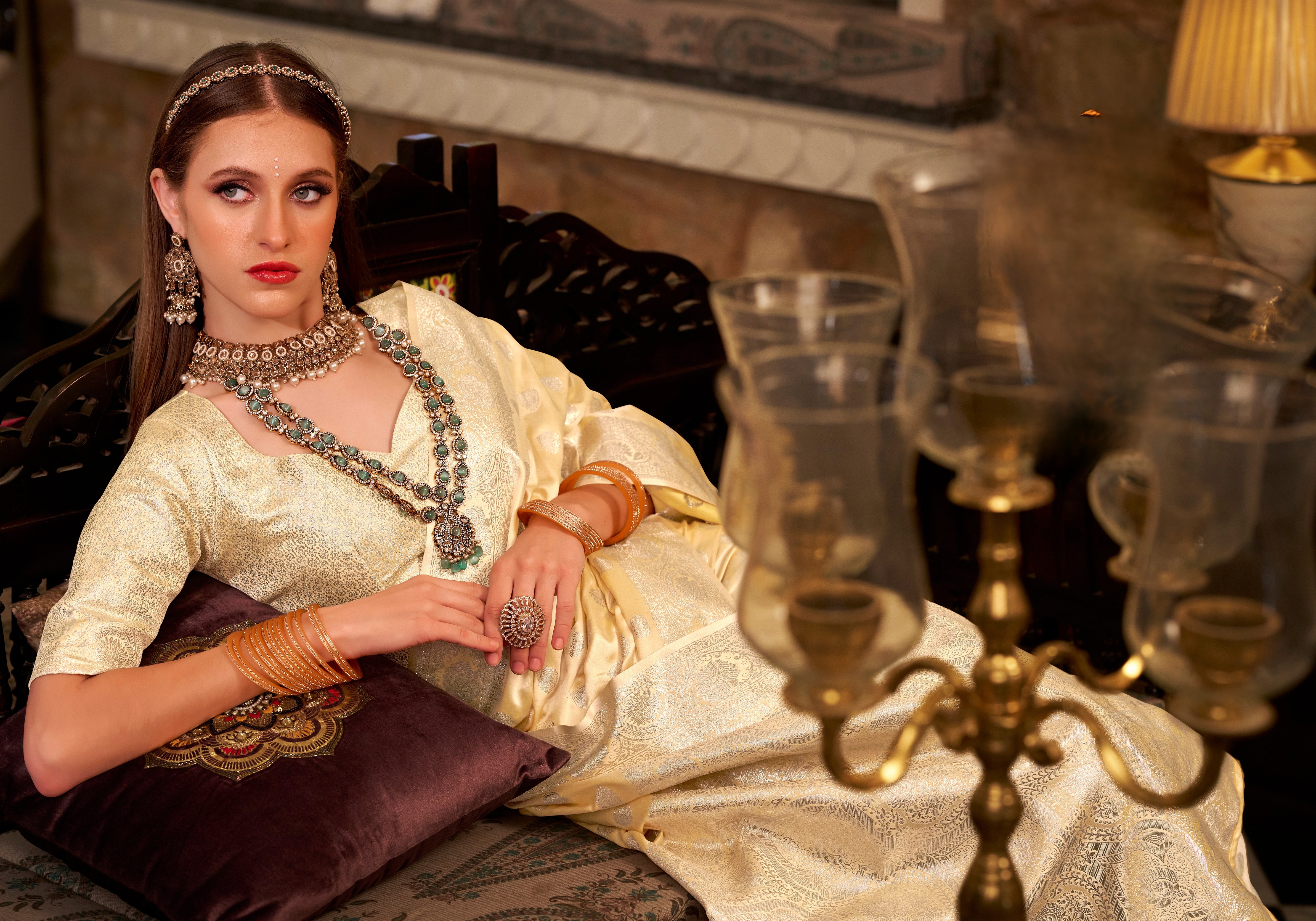 💫 Rich fabrics like silk, georgette, and velvet enhance its regal look.