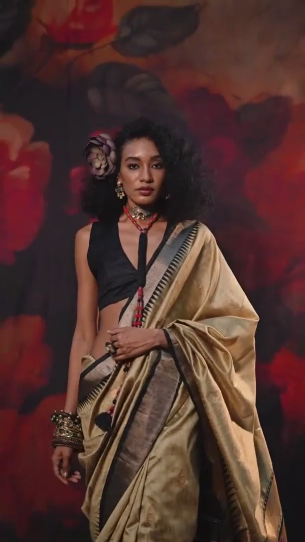 Pair the saree with oxidized silver jewelry or statement temple jewelry to complement its rich border.