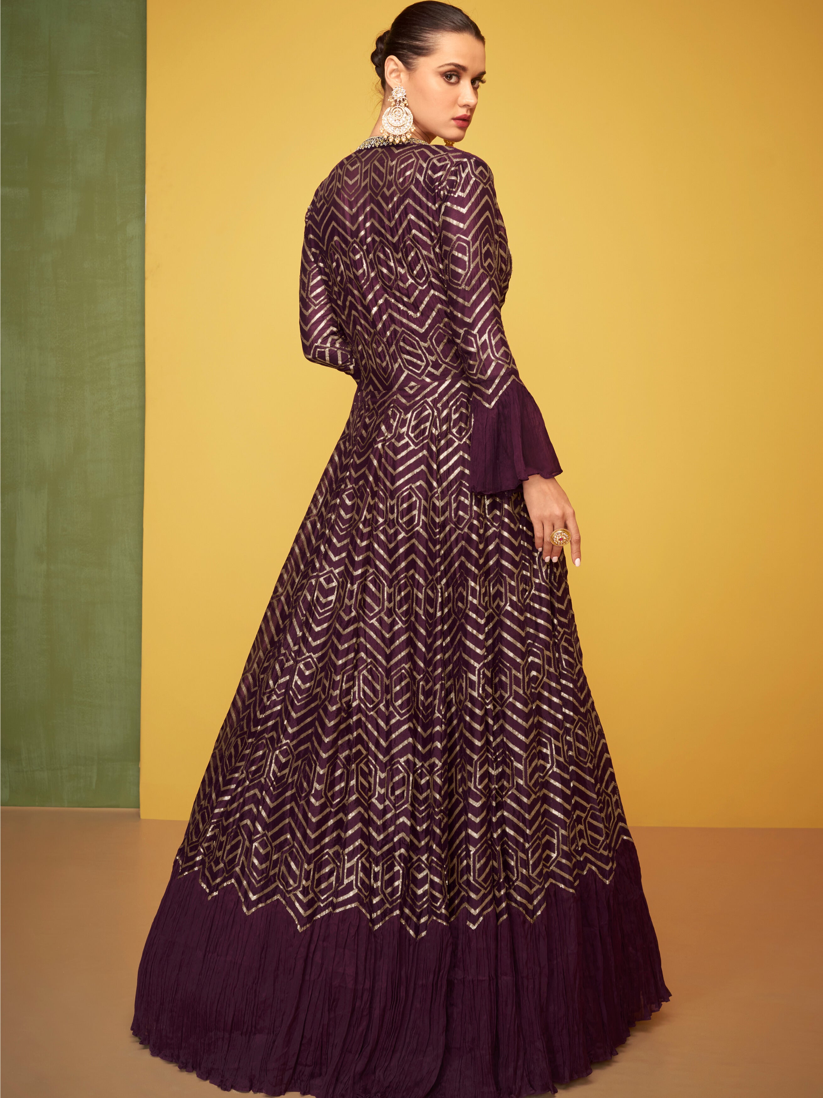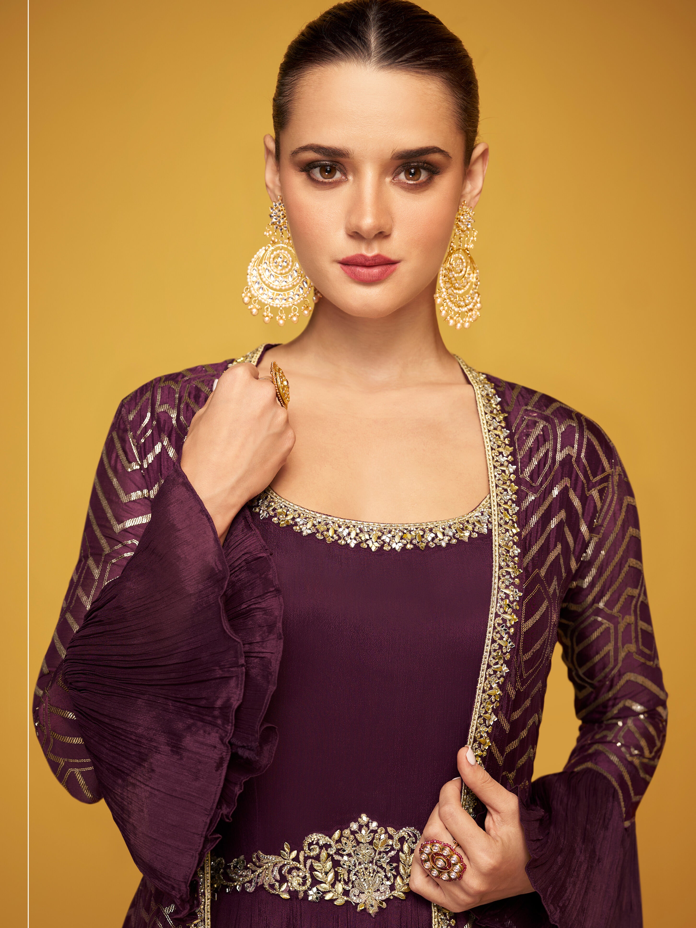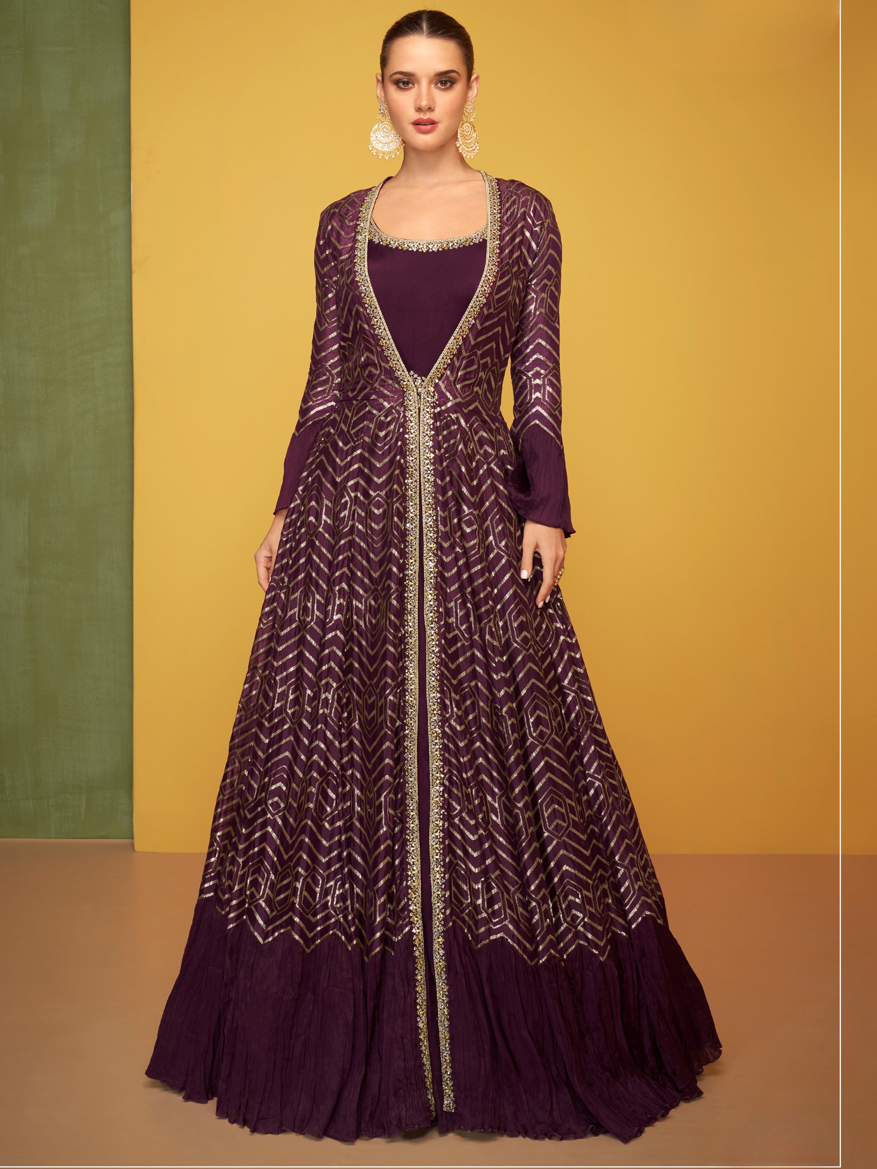Full-length premium silk shrug with intricate zari and sequin embroidery.