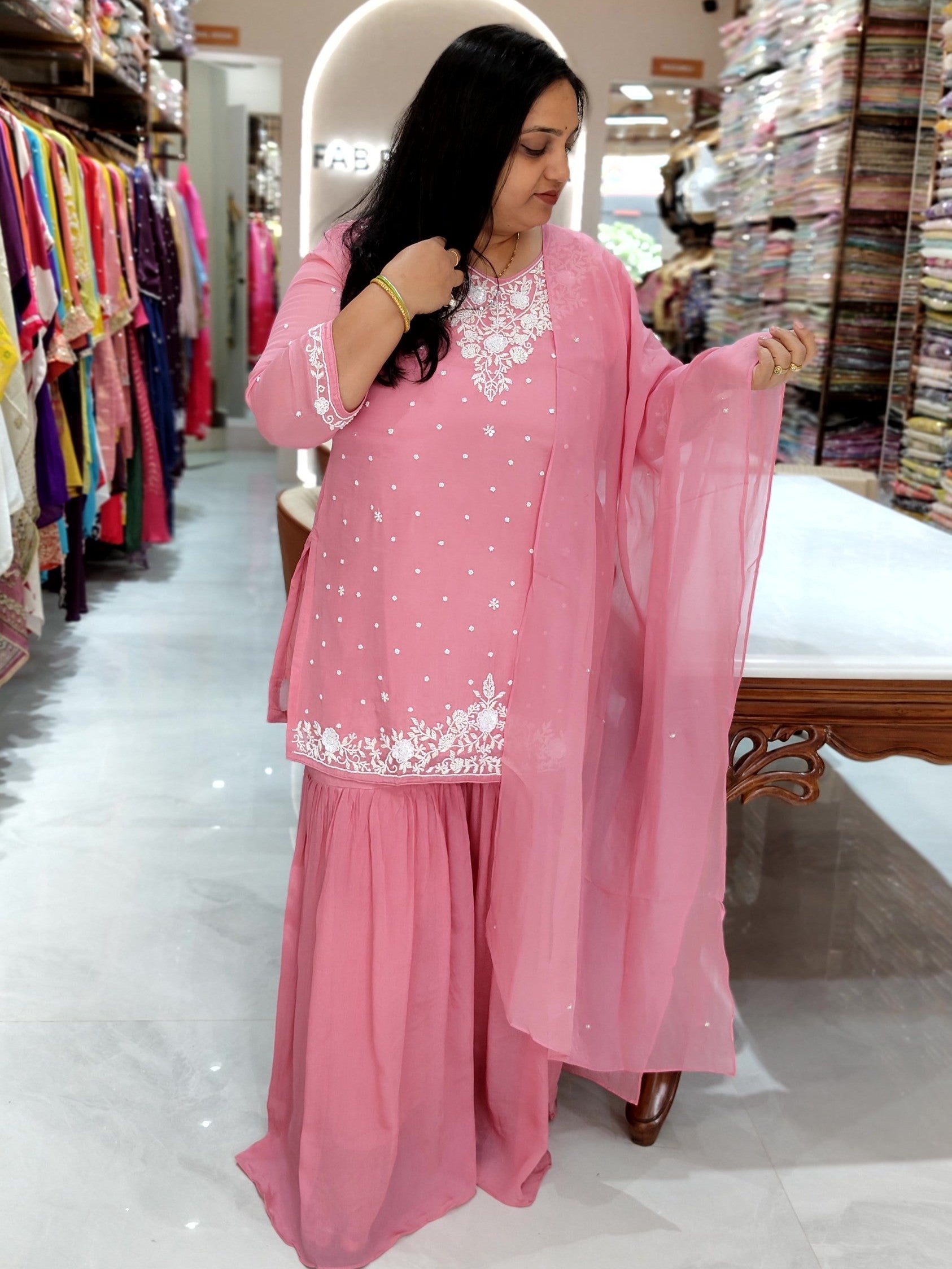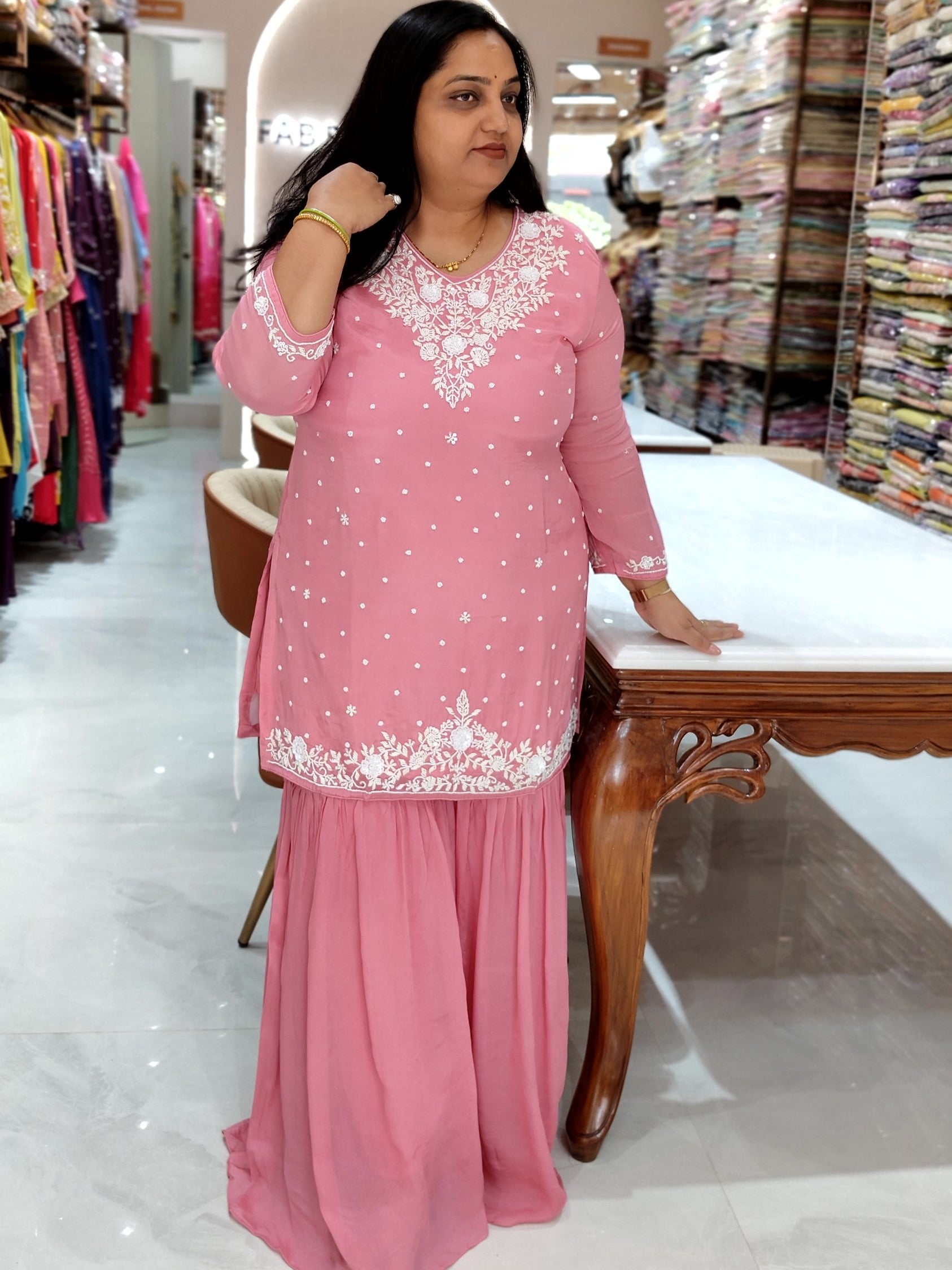 Kurta: A graceful short pink kurta adorned with intricate handwork embroidery, blending elegance with festive charm.