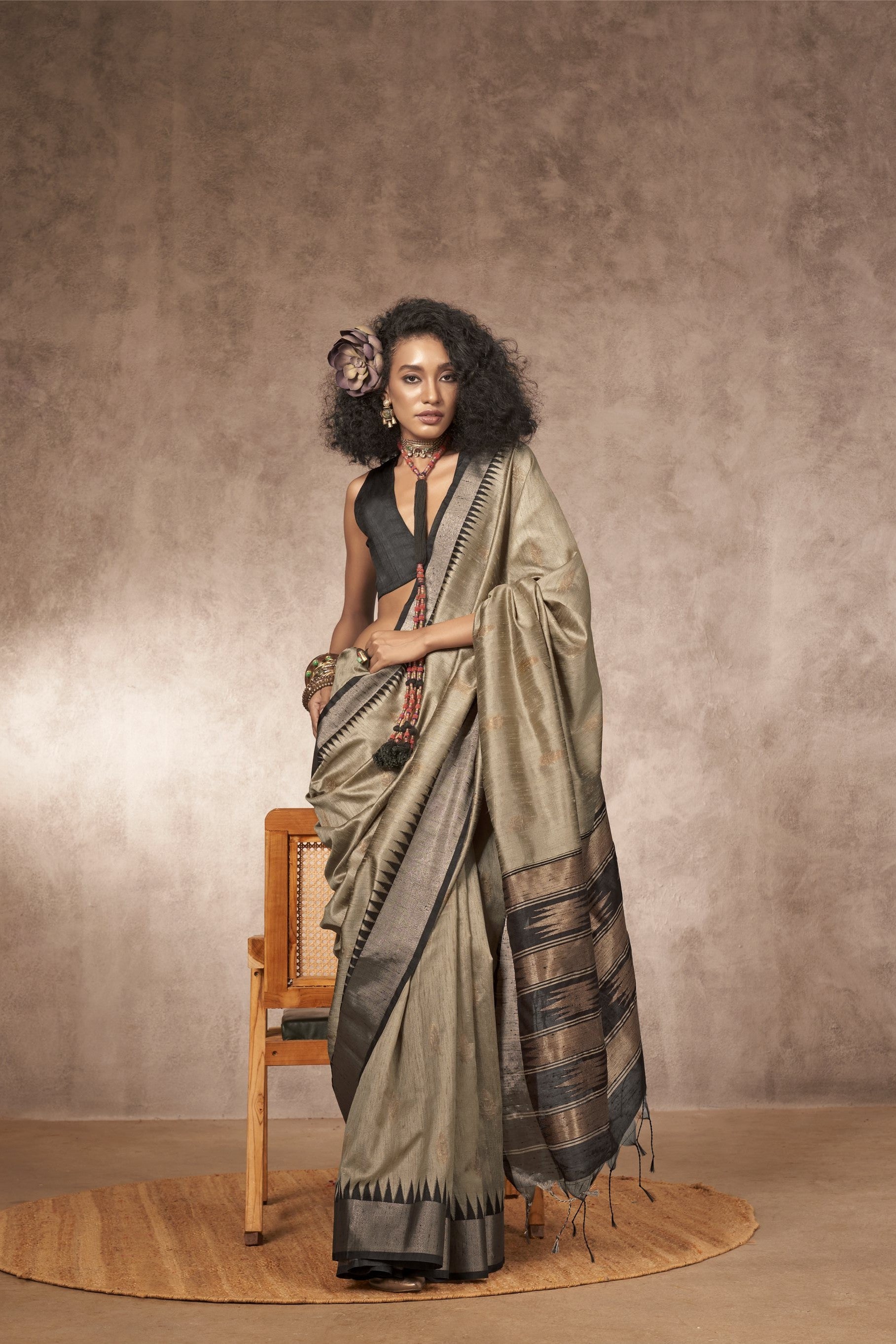 Traditional grey silk saree is beautifully highlighted with a striking black temple border, blending traditional charm with timeless sophistication. The contrast of grey and black adds a refined touch, making it suitable for both festive and formal occasions. Crafted in a graceful drape, this saree is a versatile addition to your ethnic wardrobe.