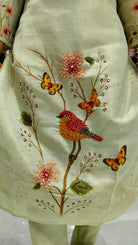*Design:* Adorned with delicate *hand embroidery* featuring floral motifs, butterflies, and a bird pattern – giving it an artistic, nature-inspired charm.
