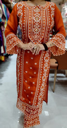 *Top:* Crafted from premium crape fabric, this straight-cut kameez is adorned with elegant *thread embroidery* on the neckline and front panel. The *loose sleeves* add a graceful, flowy touch inspired by Pakistani fashion, offering both comfort and sophistication.