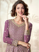 Crafted in premium georgette, this calf-length frock suit features intricate zari and sequin embroidery. The soft georgette fabric gives it a graceful fall and lightweight comfort, while the flared silhouette adds charm and elegance.