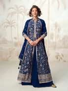 Top/Gown: A long, floor-length gown suit crafted in lightweight, flowy georgette. Elegantly designed with delicate embroidery, sequins, and zari work on the neckline and sleeves for a rich festive appeal.