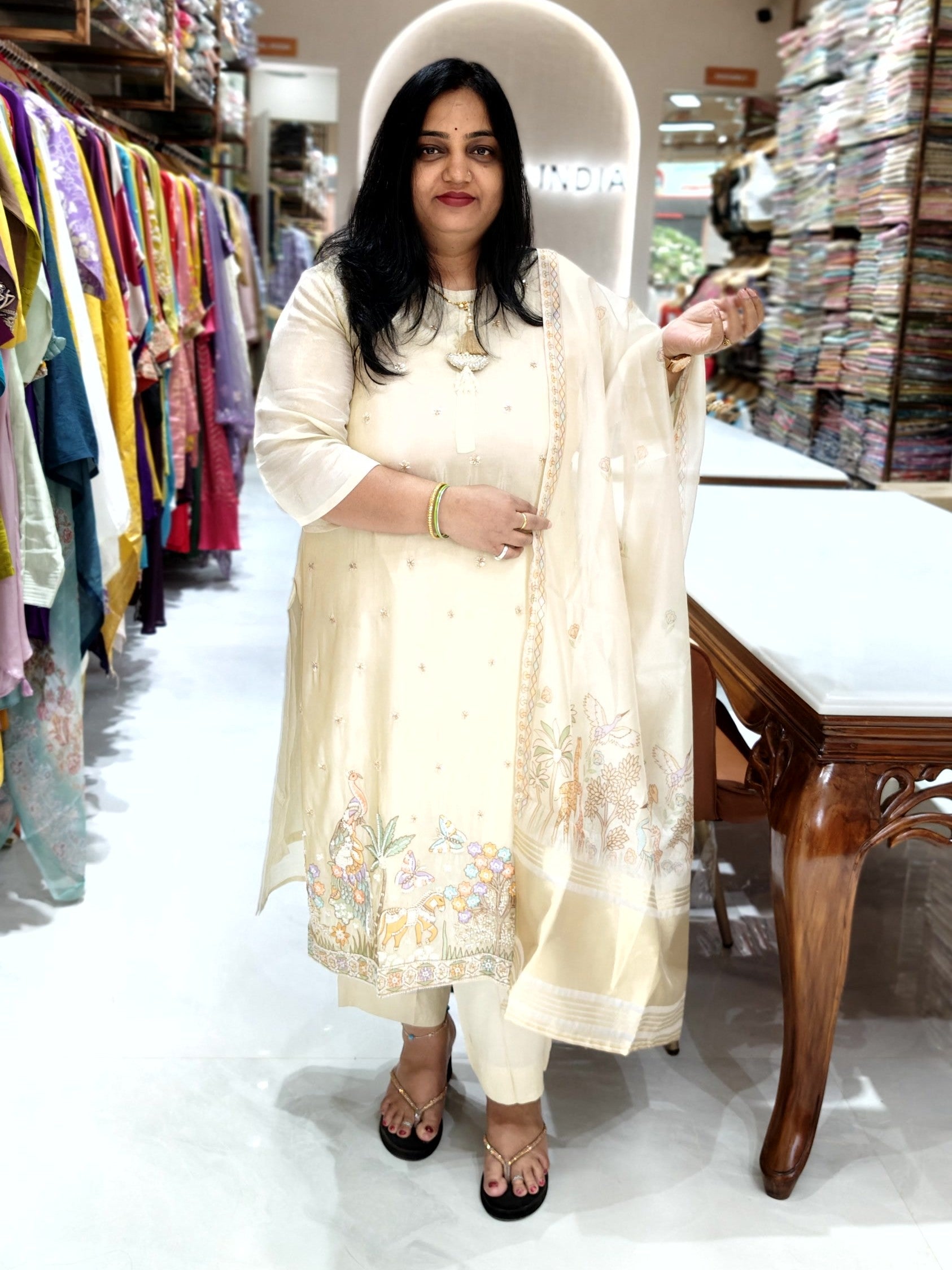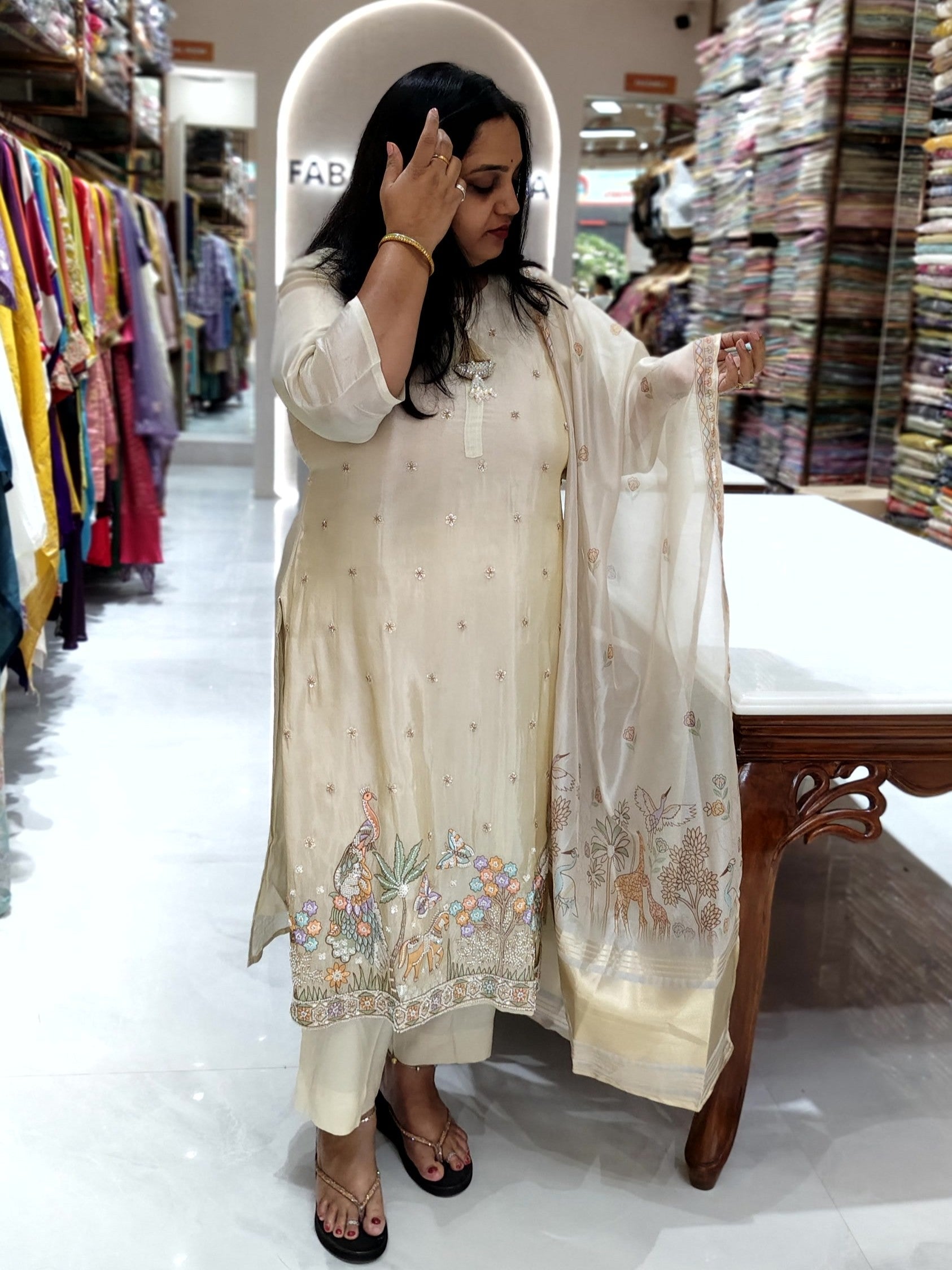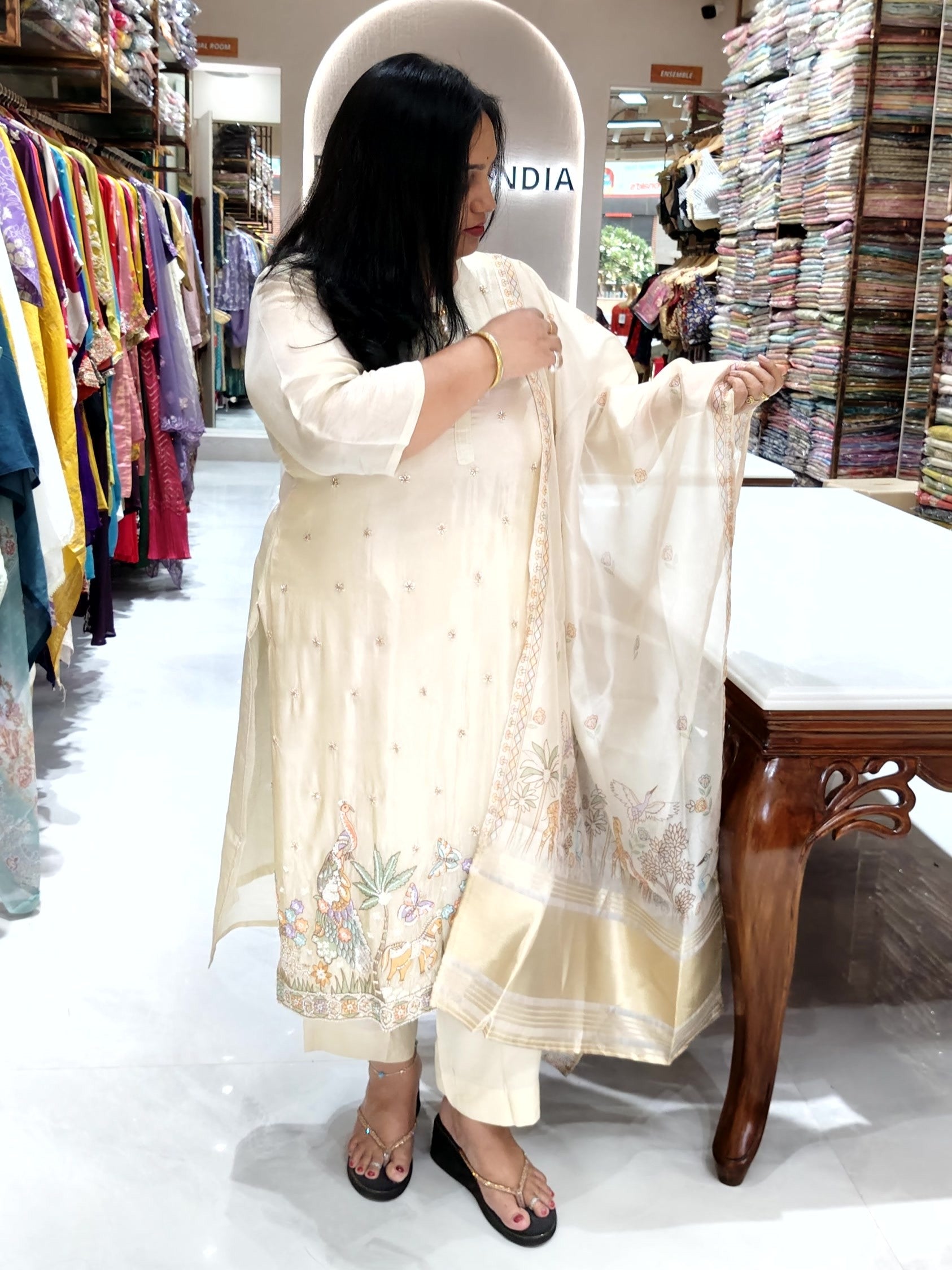 This graceful off-white suit set is crafted in a soft, flowy fabric with subtle self-embroidery scattered across the kurta. The hemline is beautifully highlighted with intricate multicolor thread embroidery, featuring motifs of peacocks, florals, and foliage that add a touch of tradition and charm. Paired with matching bottoms and a sheer dupatta adorned with delicate embroidery and a golden border, this ensemble exudes sophistication and timeless elegance.