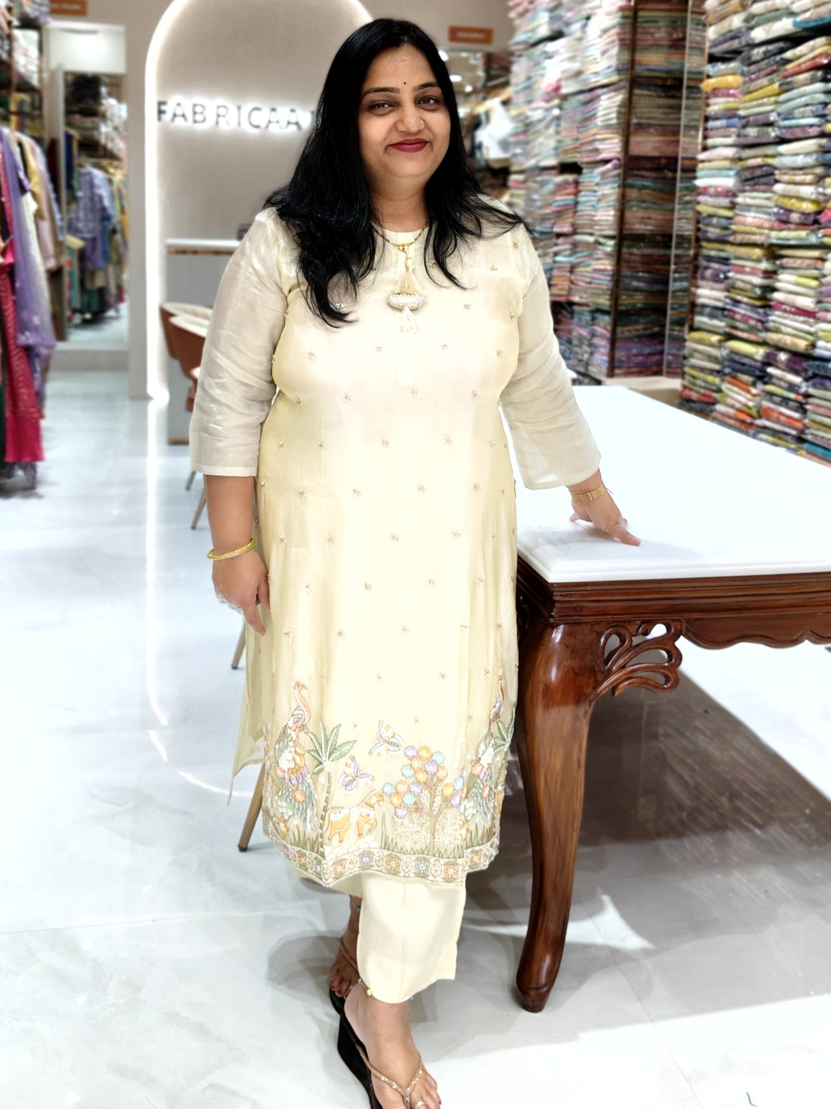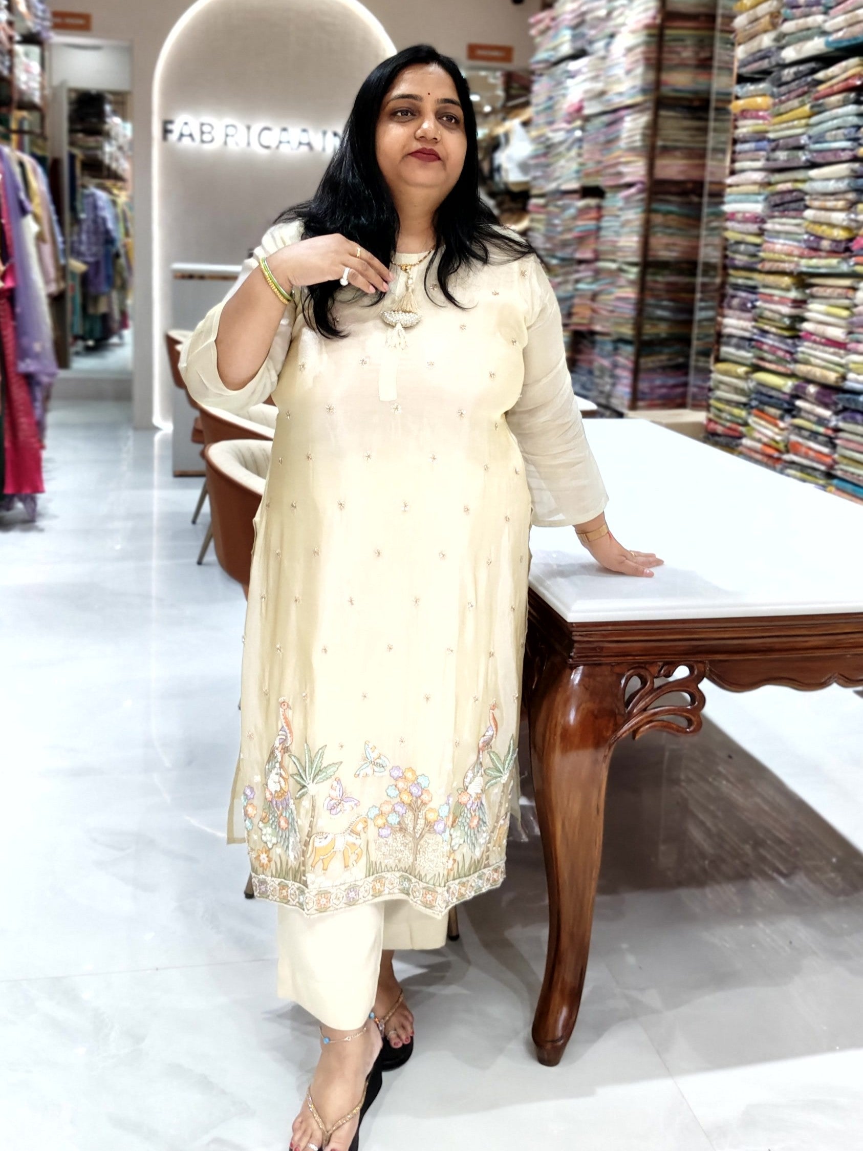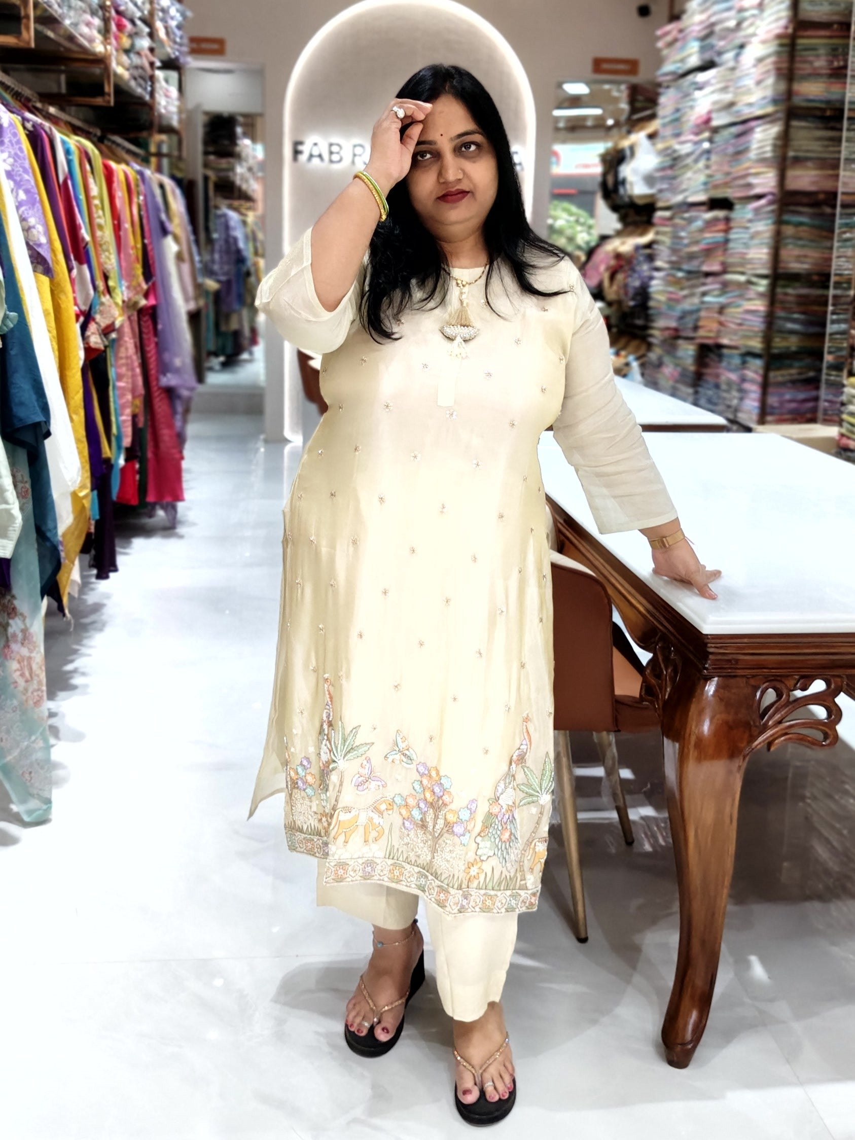 This graceful off-white suit set is crafted in a soft, flowy fabric with subtle self-embroidery scattered across the kurta. The hemline is beautifully highlighted with intricate multicolor thread embroidery, featuring motifs of peacocks, florals, and foliage that add a touch of tradition and charm. Paired with matching bottoms and a sheer dupatta adorned with delicate embroidery and a golden border, this ensemble exudes sophistication and timeless elegance.